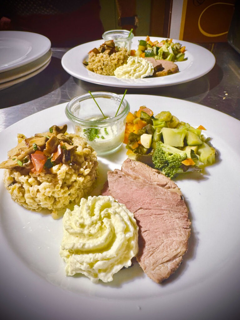 Binden, damit er die Form bekommt und hält, ein Rosmarin Zweig unter das Netz klemmen, den Braten leicht würzen mit etwas Bouillon und Senf. Danach wird er vakuumiert und min 24h bei 54°C im Wasserbad gegart. (Dazu braucht es einen Sous-vide Stab oder einen Dampfgarer). ca. 20 Min vor dem Anrichten, muss der Braten noch scharf angebraten werden, entweder im Ofen bei 275°C oder auf dem Grill und dauerndem Wenden und drehen. Nach 15 Minuten vom Grill nehmen und 5 Minuten ruhen lassen, damit sich das Gewebe entlastet. Und dann in feine Scheiben schneiden. und servieren.